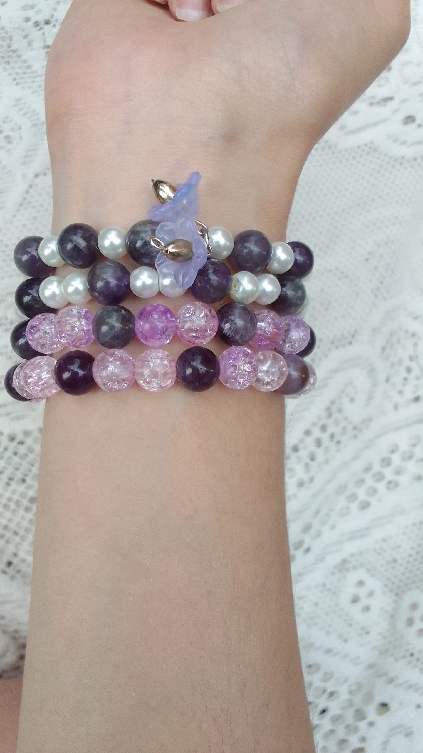 Add a touch of royalty to your outfit. This bracelet combines two purple tones and white for a regal look.